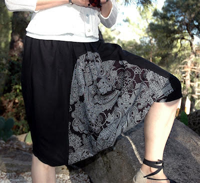 Hoy vengo con una prenda un tanto extraña. Para hacerla he utilizado un pantalón Thai y la tercera de las telas que me regalé por mi cumpleaños. En principio me quería hacer una blusa con ella pero el dibujo me pareció un tanto excesivo, sin embargo aquí como complemento al negro del pantalón creo que queda bonita y original. El pantalón casi no lo había usado por que a pesar de ser cómodo y muy fresco, no era capaz de ponérmelo bien. Así que decidí reciclarlo y darle utilidad, para ello me basé en una falda pantalón tipo Sauriel que tengo y que me encanta. Y de nuevo me decidí por la ingeniería inversa o "knockf off" para hacer algo parecido.